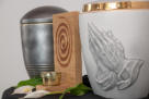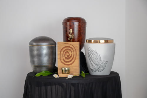 Bestattungswäsche, Grabkreuze, Urnen.